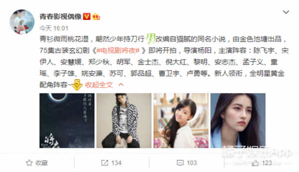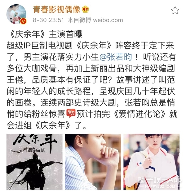 事情是酱的,橘子君看到电视剧号@青春影视偶像发了条消息,说张若昀要担当《庆余年》的男主角了。