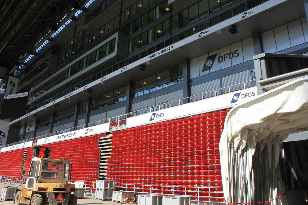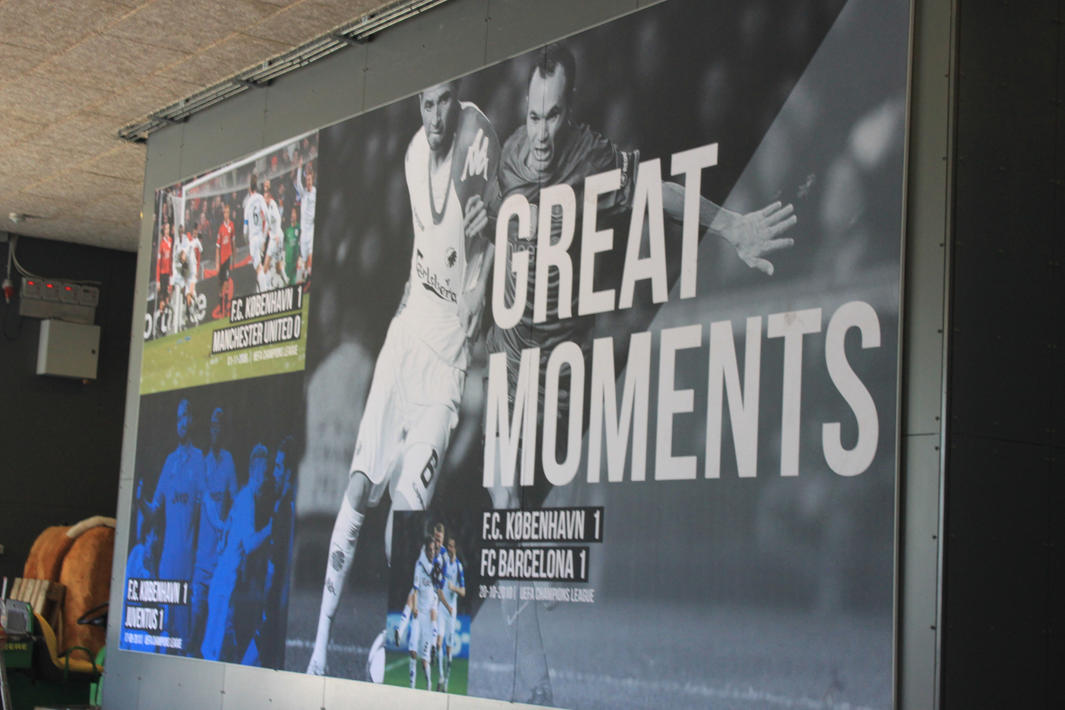 球场内忙碌的工作人员看似正在为活动做着准备,除北看台外均为双层看台搭配红色座椅,而北看台则只有下层看台,并且座椅已被收起,想必整面看台是为了放置如演唱会等活动的巨大屏幕或者为舞台布景所用。每个看台都被不同的赞助商冠名。其中东看台是球场的主看台,VIP包厢和媒体室也均在这面看台中。当然其他看台也设有VIP包间。往回走才发现因为太着急看球场,而错过的球员通道和采访区,其中客队球员通道外的墙壁上印有哥本哈根在这座球场取得的优异成绩,这也是为了给造访这里的客队在赛前制造一些心理压力。抓紧时间噼里啪啦地摁下相机快门,这次过程稍微曲折但结果不错的造访圆满收官。