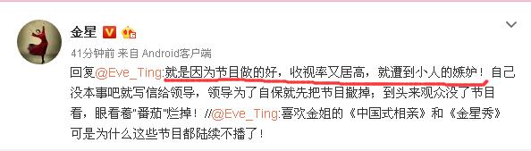 无数网友都在评论追问原因,金星也没有第一时间回应,过了两天,金星果然还是忍不住了,在微博上回复了一个网友,说出了停播的原因。金姐毫不客气,说是因为节目做得好收视率又高,就遭到了小人眼红嫉妒,领导为了自保就把节目撤掉了。