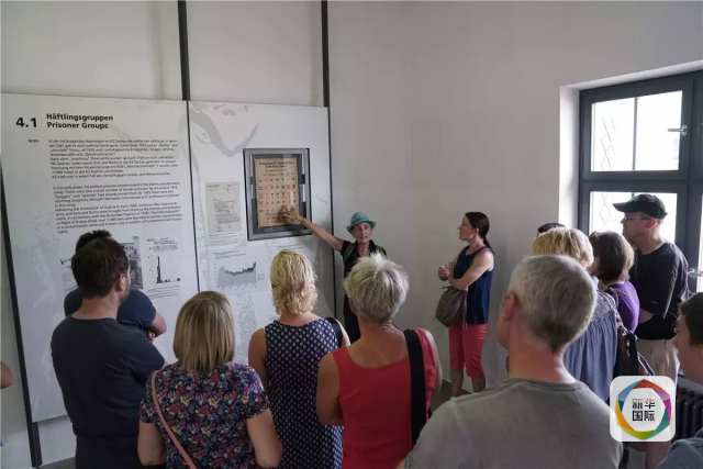 参观者在达豪集中营内听讲解员介绍囚犯被要求佩戴的各色标志。不同颜色代表着不同的所谓“罪行”。(新华社记者袁帅摄)