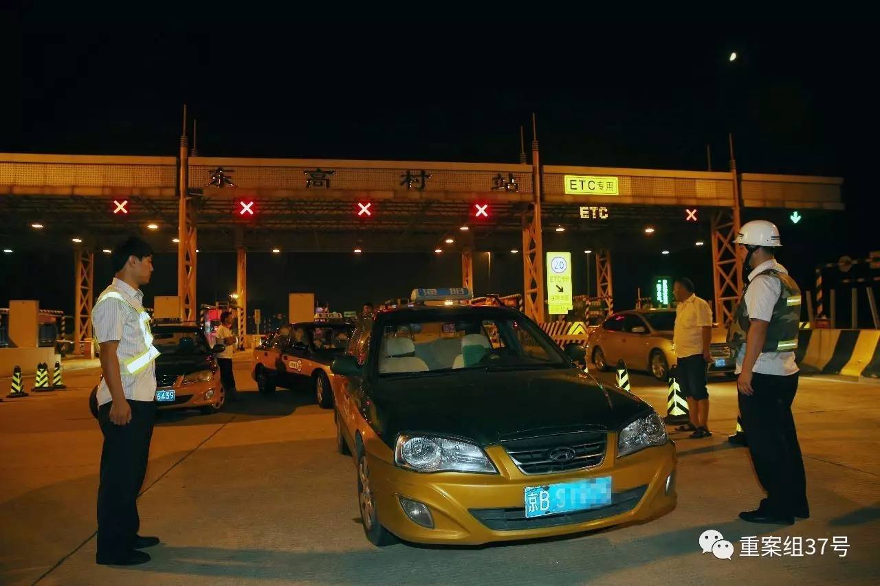 ▲8月30日,京平高速东高村站晚9时许,三辆闯卡逃费的出租车被拦截。 新京报记者 王贵彬 摄