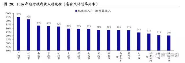 我们以“税收收入/一般预算收入”指标来衡量地方政府的收入稳定性,在30个省会城市中,仅有16个省会和计划单列市公布税收收入,根据有数据覆盖的各省会城市排名看,2016年财政收入稳定性集中在70-95%之间,其中,广州收入稳定性最高为95%,其后依次为杭州、南京、宁波、沈阳,较高的收入稳定性指标意味着一般预算收入的稳定性较高,持续性强。2016年收入稳定性最低的是南宁、呼和浩特、郑州和石家庄,分别为74%、73%、71%和70%。