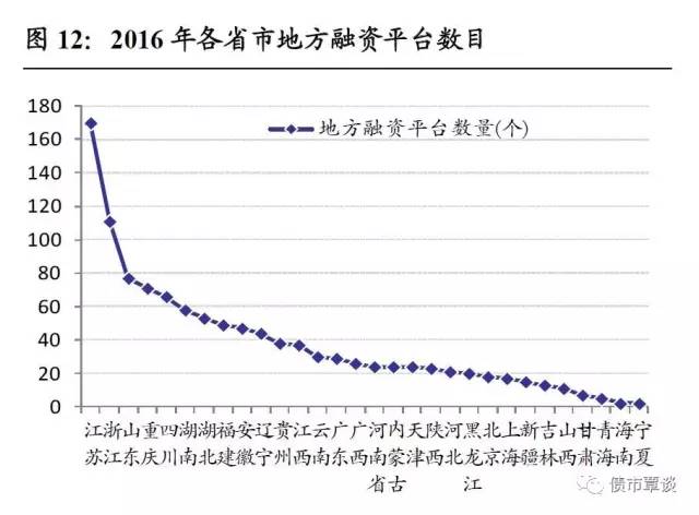 2)从各省市地方融资平台数目对比看,根据wind城投发行人统计,江苏、浙江、山东、重庆和四川排名居于前5 位,尤其江苏和浙江两省均在100家以上,有19个省市地方融资平台数目在10-50家之间,占比在63%,而宁夏、海南、青海、甘肃和山西的地方融资平台发行人数目最少,仅为2、2、5、7和11家。