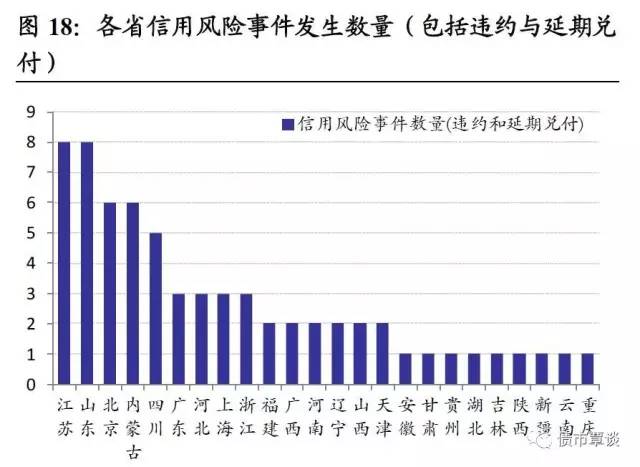 随着区域信用违约事件增多和违约债务规模攀升,投资者对于部分违约事件多发、信用事件涉及债务规模较大的区域关注度和警惕度显著提高。自2014年以来,辽宁、江苏、内蒙、山东、四川等地发生多起信用风险事件,我们以2014年以来各省市违约债券有息债务总规模(包括实质违约与延期兑付)、信用事件发生数目,来衡量信用风险事件对于投资者评估各省区域性信用风险的影响和偏好。