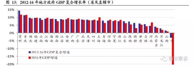 对比2016年与近4年GDP年化复合增长率,辽宁、新疆、贵州、陕西和青海下滑幅度最为明显,分别低于4年均值20.4、3.3、2.7、1.8和1.5个百分点,而河北、上海、安徽、浙江和江西等省市2016年GDP增速整体呈现加速,相比过去4年年化复合增长率上升0.68~2.17个百分点。