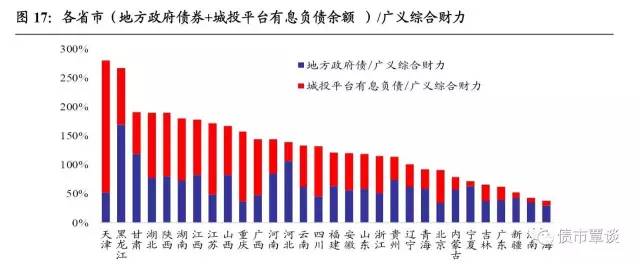 我们以“城投平台有息负债余额+地方政府债余额”衡量各省份的广义融资债务负担,并以“(城投平台有息负债余额+地方债存量)/GDP”和“(城投平台有息负债余额+地方债存量)/广义综合财力”,来衡量各省债务率和偿债风险,数据时点均为2016年末,分子、分母数据时间截点相同,则主要结论如下: