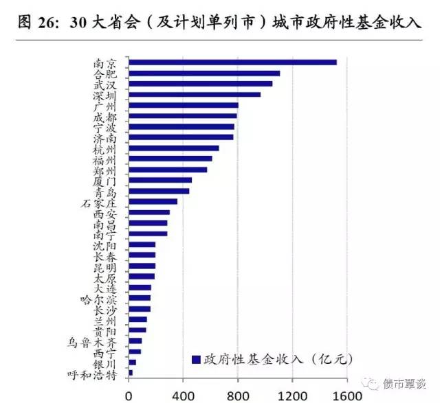 从政府性基金收入看,2016年房地产销售火爆,推动一线与二三线核心城市房价和土地出让金大涨,其中,南京、合肥、武汉、深圳和广州等核心二线和广深地区排名居前,分别达到1523亿、1110亿、1055亿、966亿和802亿;此外,成都、宁波、济南政府性基金收入也在700亿以上;政府性基金收入排名较低的省会城市主要有呼和浩特、银川、西宁、乌鲁木齐和贵阳等西部地区,总收入均不超过100亿。