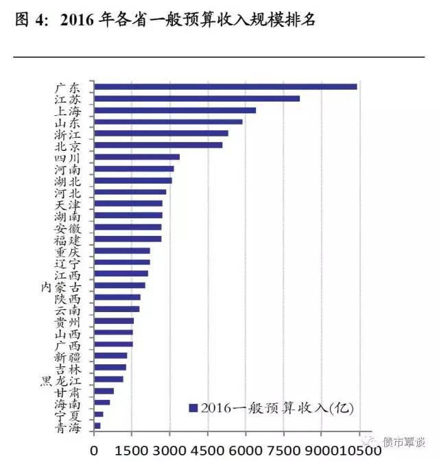 我们主要以地方政府2016年一般预算收入(公共财政预算收入)和政府性基金收入衡量地方政府的财政实力。财政收入之于政府,就如同收入或现金流之于公司,是政府各项支出以及偿债资金的直接来源。一般预算收入是衡量地方政府财政实力的核心指标,相较于基金预算收入和上级转移支付收入,更为内在和稳定。各地区的2016年财政收入状况均来自当地财政厅关于2016年预算执行情况和2017年预算草案的报告。