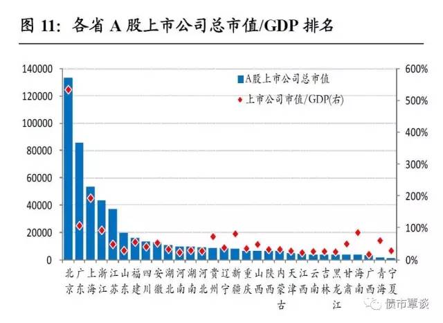 1)在各省市A股上市公司总市值/GDP排名中,北京、上海、广东、浙江等排名居前,占比分别达535%、194%、108%、93%,反映资本市场证券化率和投资机会较高;有20个省市这一比例低于50%,其中,广西、江西、河南、黑龙江和吉林等省A股上市公司市值/GDP占比最低,仅为17%、23%、23%、25%和26%。