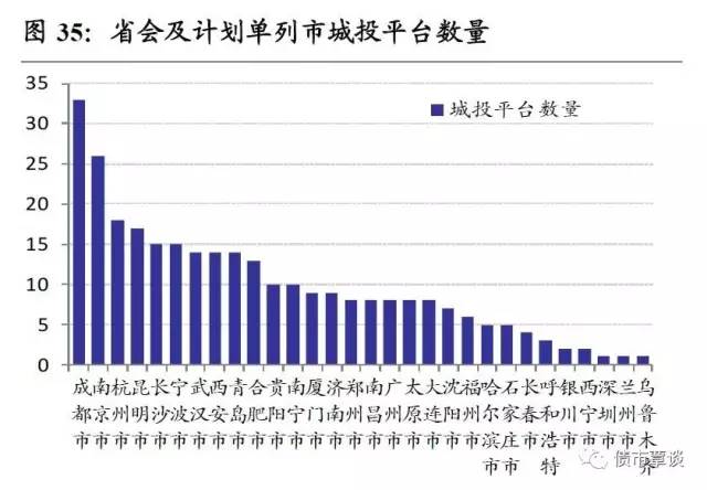 2)从各市地方融资平台数量指标看,成都、南京、杭州、昆明和长沙排名前5位,市级城投发行平台数目分别达到33家、26家、18家、17家和15家,而地处西北部的乌鲁木齐、兰州、西宁和银川平台数目均不到3家,此外深圳市级平台也仅只有1家。