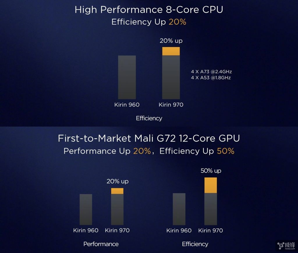CPU 部分,麒麟 970 与上一代麒麟 960 一样为八核心设计,由 4 个主频为 2.4GHz 的 Cortex-A73 大内核与 4 个主频 1.8GHz 的 Cortex-A53 内核组成,性能上无变化,毕竟同样架构频率,传闻所说的 2.8GHz 主频吊打骁龙 835 并没能实现, 但跑分上追平骁龙 835 应该没问题,并且得益于 10 纳米工艺的进步能效提升 20%。