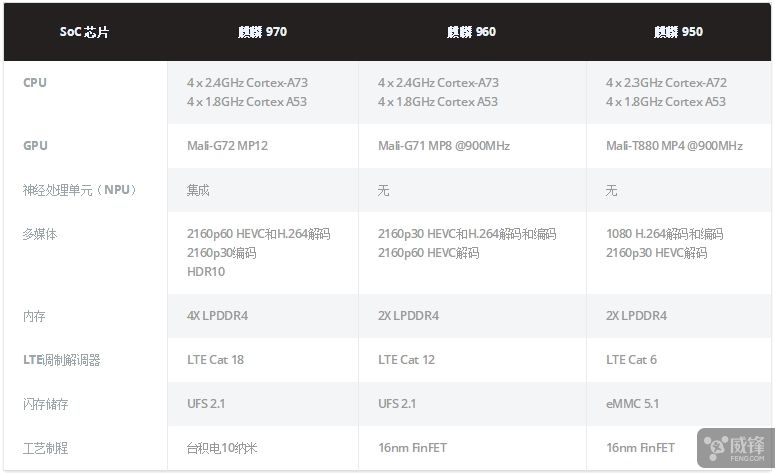另外,麒麟 970 集成有最新的 i7 协处理器,视频解码支持 4K HDR10 格式,内建 TEE 和 inSE 安全引擎,拥有更高的安全性集成 HiF 级硬盘芯片,支持音频流高达 384KHz/32bit 母带级别音质。需要注意的是,华为官方参数标明,麒麟 970 不仅最高支持 LPDDR4X 内存,而且还支持 UFS 2.1 闪存储存,未来推出的麒麟 970 设备时候还混用 eMMC 闪存就不清楚了,毕竟上一代麒麟 960 也支持 UFS 2.1。