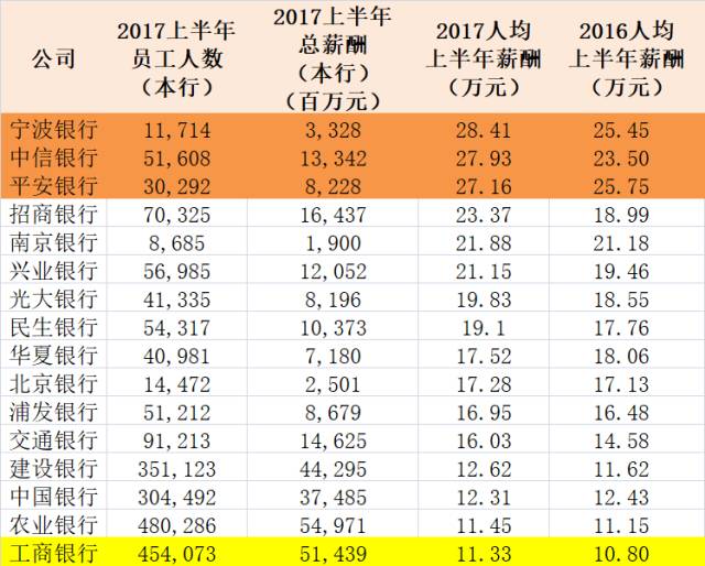 和其他行业进行对比,银行业的人均薪资明显不如券商行业,中信证券、国泰君安、海通证券和广发证券的2017年上半年母公司人均薪资最低为29.98万元,都高于银行中最高的宁波银行28.41万元。