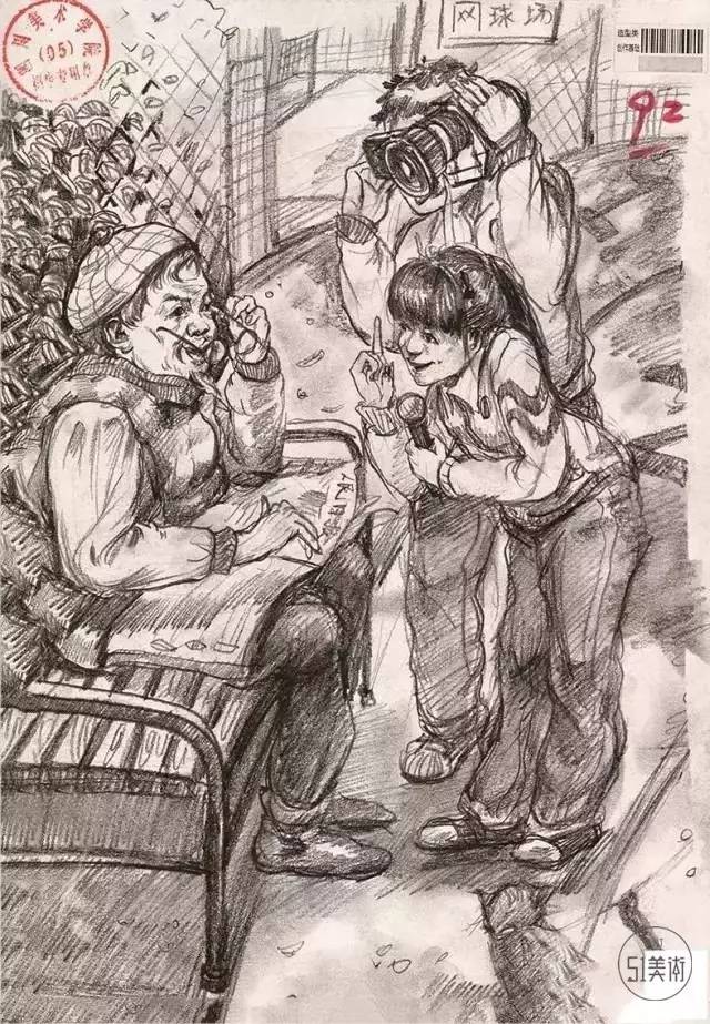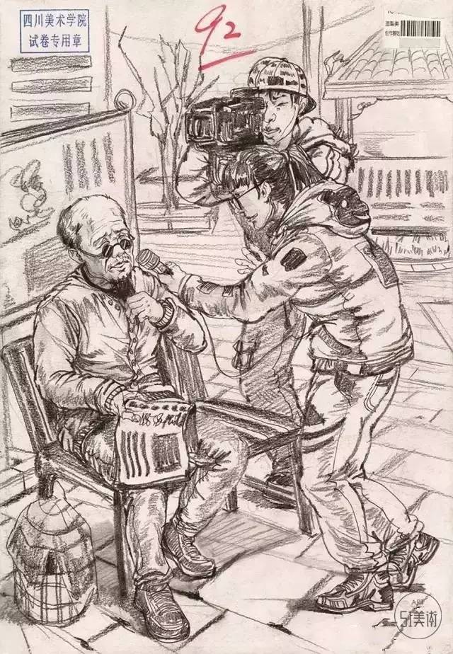 人物命题组合(速写)考题3:根据以下文字描述的情结作画:清晨的校园里,一位老伯正独自坐在长椅上看报。两个学生(一男一女)拿着采访机和相机走过来,其中一人鞠着躬礼貌地问:“我们是学校新闻社记者,能采访您一下吗?”征得老伯同意后,学生对老伯进行了采访。