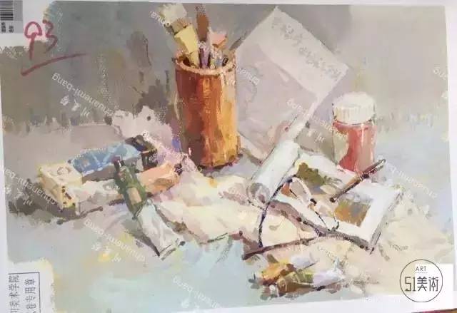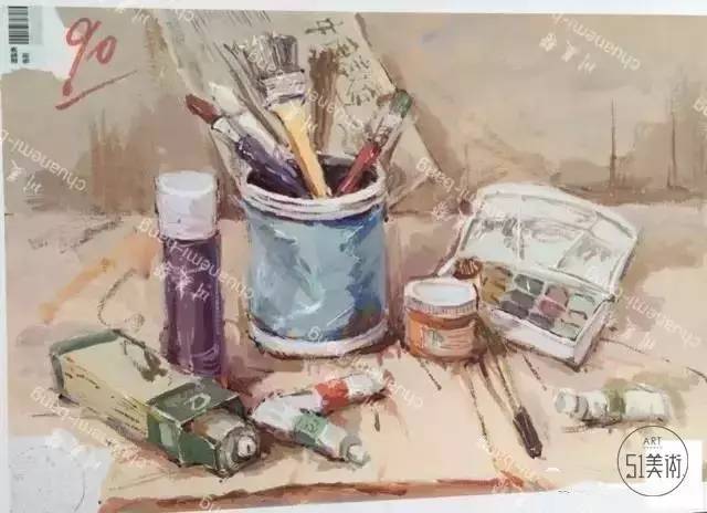 色彩作画工具(如笔筒、笔、刷子、颜料等)、眼镜、本子、衬布;