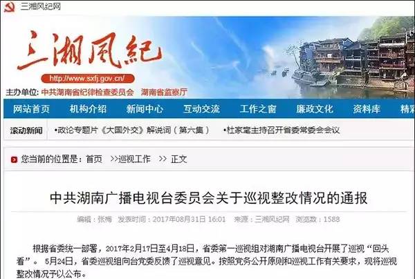 根据通报,2017年2月17日至4月18日,(中共湖南)省委第一巡视组对湖南广播电视台开展了巡视“回头看”。 5月24日,省委巡视组向台党委反馈了巡视意见。随后,湖南广电进行有针对性的整改。