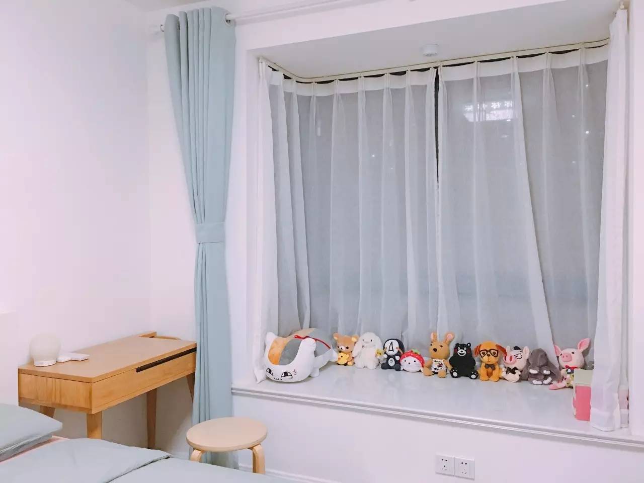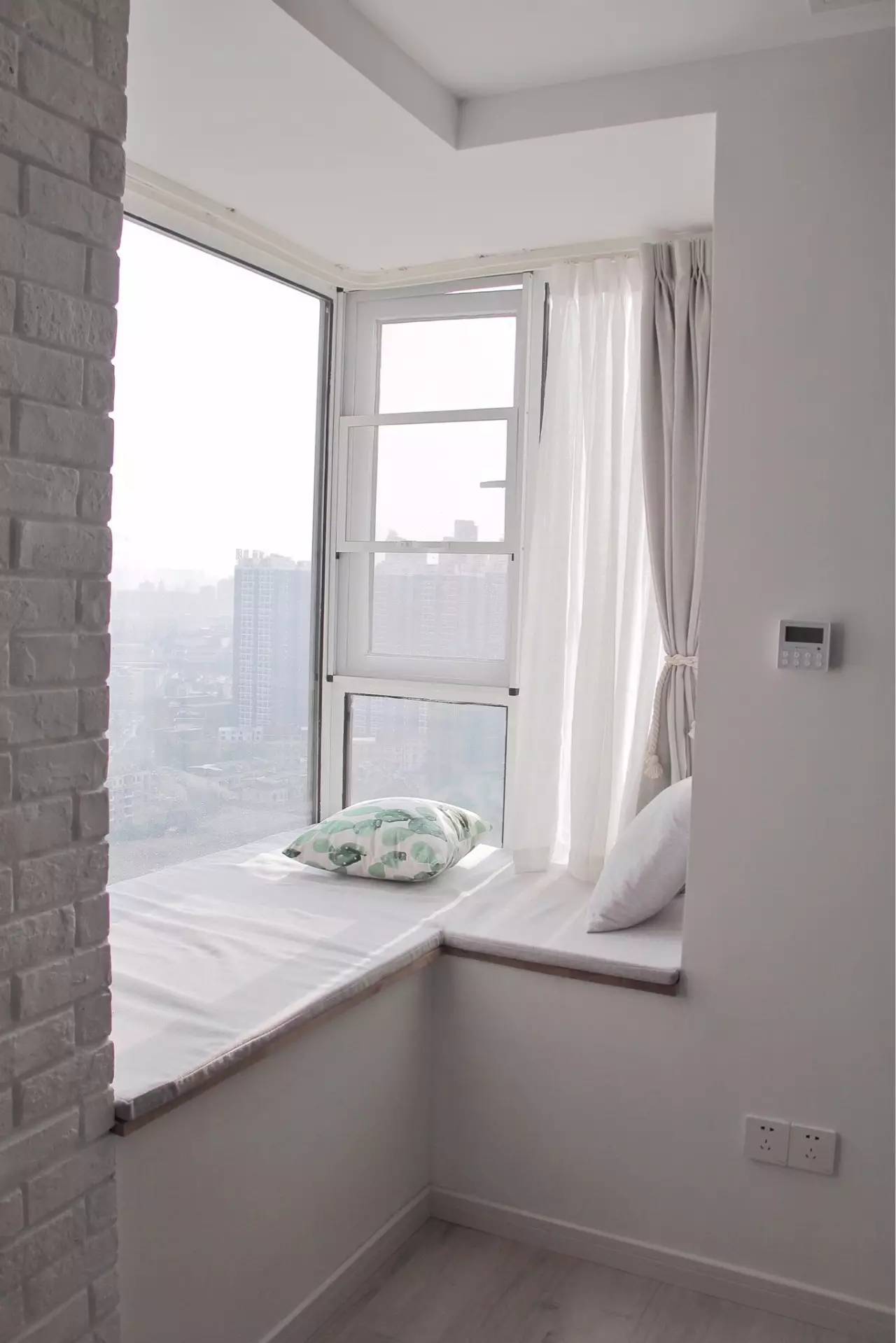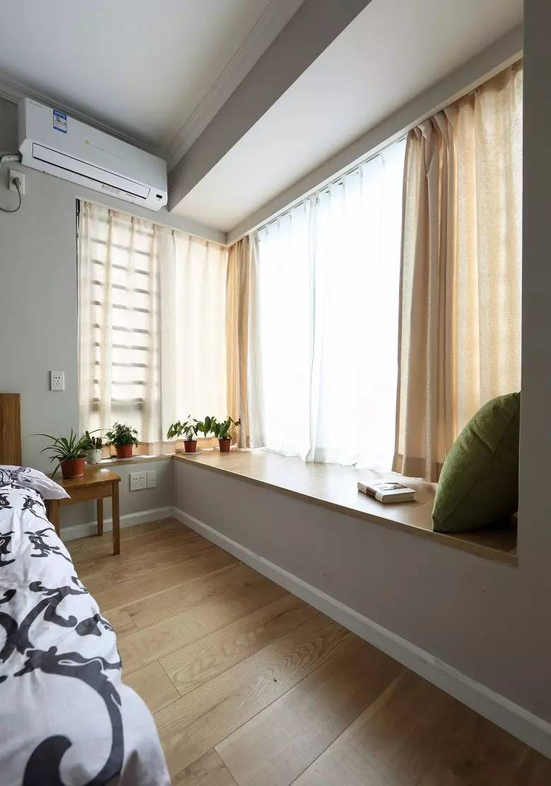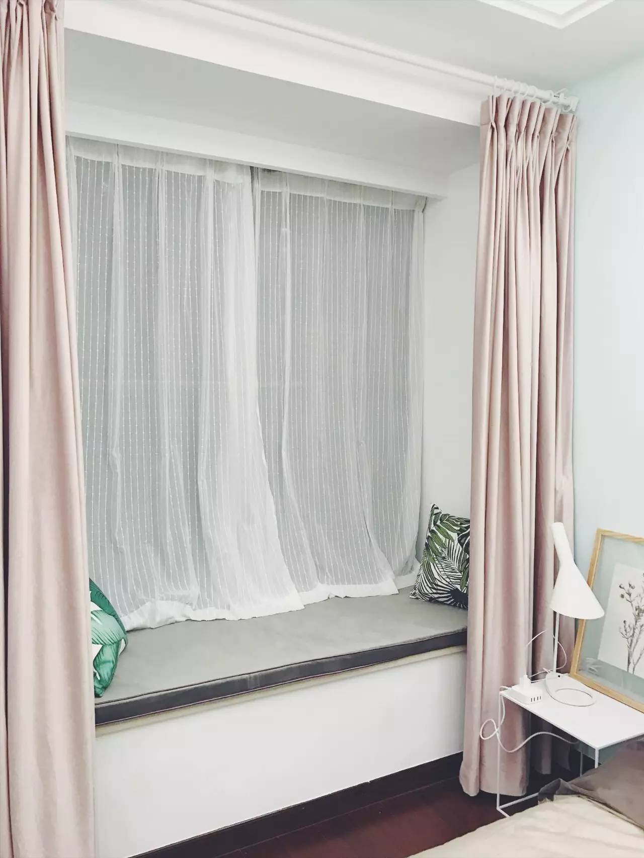 选择这种方式的话,个人感觉在使用体验上会好一些,直接拉动即可,不会像第一种方式那样,尤其是对于U字型的飘窗,窗帘拉起来的手感没那么好,仿佛总感觉不那么顺畅,其次,一般这桩安装方式的窗帘,它的长度大多数都是接近地面,从美观的角度来说,这样的安装方式会比较好看,尤其是对于小飘窗,大家可以借鉴这种做法,值得大家注意的是,窗帘安装在卧室内,意味着飘窗台面经常会被太阳晒,那么间接的对于飘窗台面的使用寿命就要降低了;