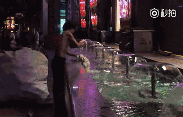 视频中他正在街上的喷泉池里给狗狗洗澡擦身体,