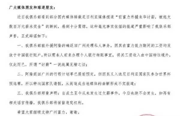 昨日,广州富力在其官方微博发布关于前富力外援阿隆“讨薪”事件的辟谣声明,对于前富力外援阿隆来华讨薪相关报道进行正式辟谣。