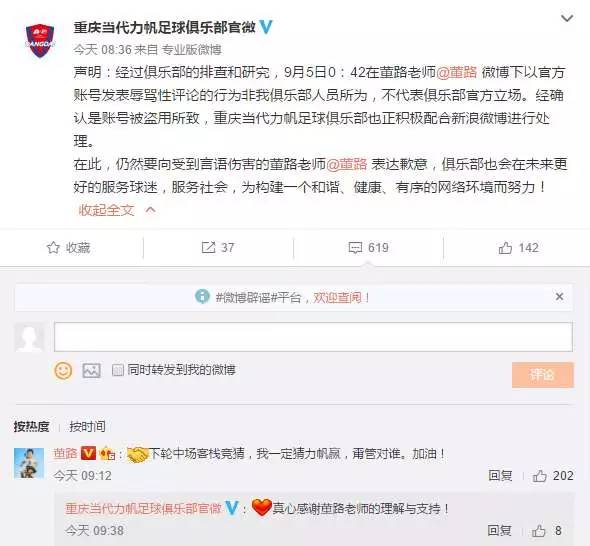 知名中超解说员董路在微博上直播聊国足,但随后重庆当代力帆官方微博账号转发并辱骂董路。昨天,力帆俱乐部发布声明,表示以官方账号发表辱骂性评论的行为非俱乐部人员所为,经确认为账号被盗用所致。