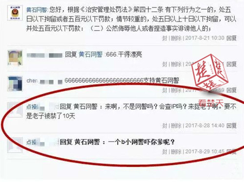 “来啊!不是网警吗?会查IP吗?来抓老子啊!不过你会查IP吗?要不要我教教你?”之后的几天,该用户仍然天天在贴吧内向民警挑衅。