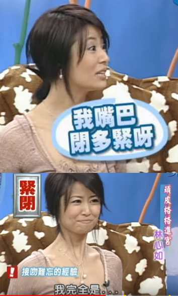 据台湾“东森新闻云”报道,林心如2004年曾在访谈节目《康熙来了》谈及最难忘的接吻经验,当时小S问及有没有拍过伸舌头的吻戏,她急忙表示拍吻戏没有人伸舌头的。但是小S随后追问“尔康也没有”,她露出夸张表情并直呼“我嘴巴闭得多紧啊”,随后她还坚称自己不仅紧咬牙关还紧闭双唇,坦承对方真的有试图伸进来。可她也有帮忙解释,称可能对方是太投入在演戏当中,“也不是故意想顶的”。