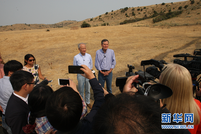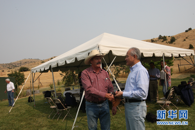 中国驻美国大使崔天凯(右)与当地牧场主克雷格·摩根(左)握手交谈。新华社记者颜亮摄