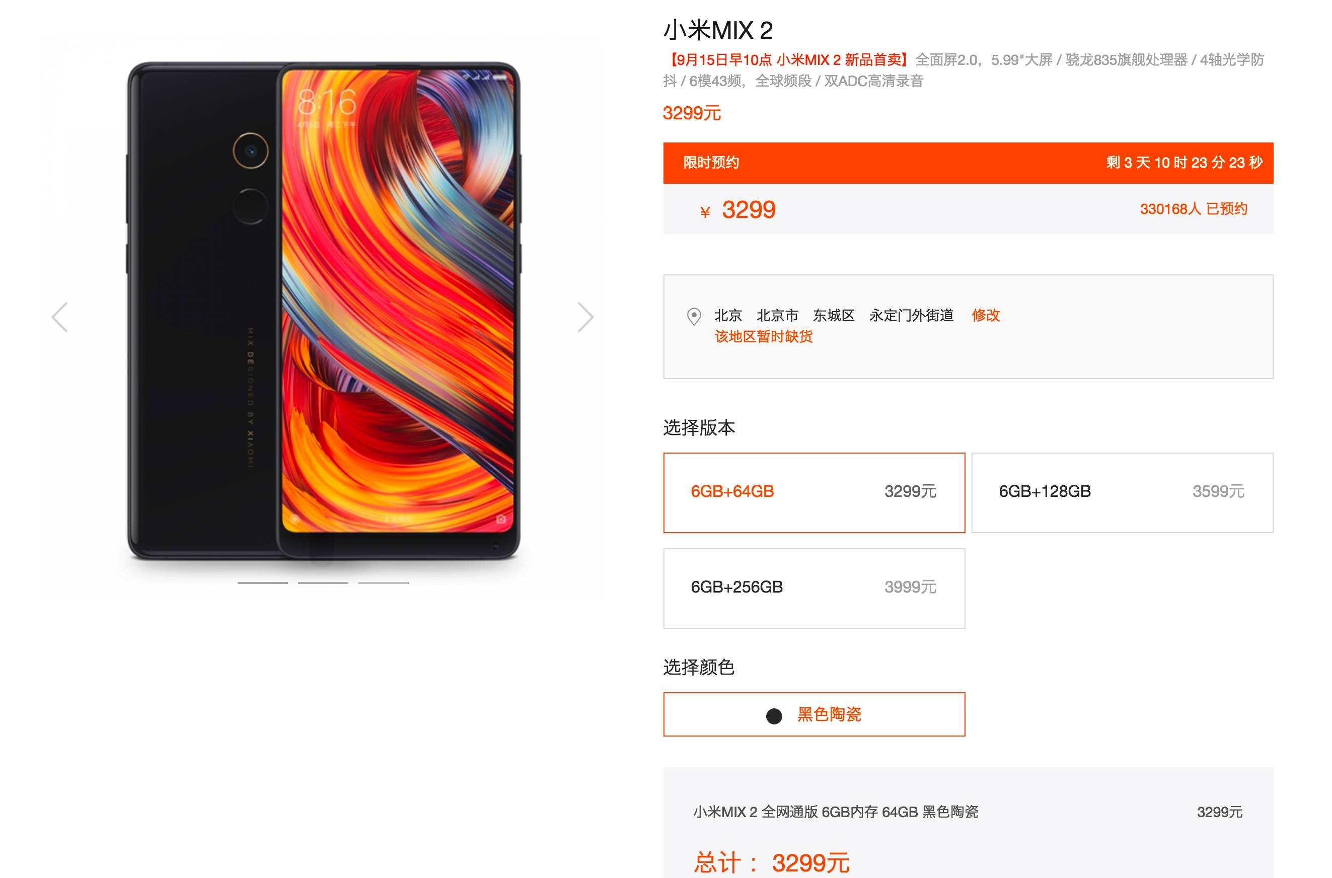 6GB + 64GB 标准版 MIX2 :3299 元