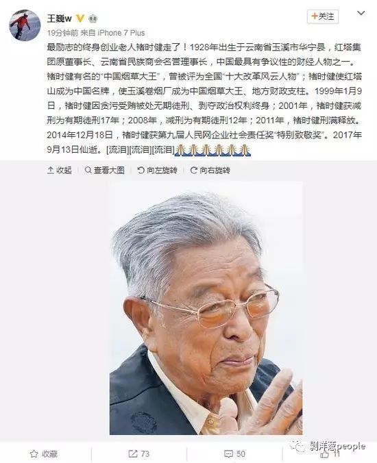 9月13日10点45分,中国金融博物馆理事长王巍发布了一条微博——“最励志的终身创业老人褚时健走了!” 配图里的那个老人,头发没有完全白,金边眼镜,有一张长满皱纹但硬朗的侧脸。