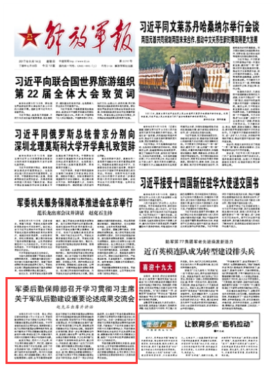 从今年4月开始,军委后勤保障部机关、直(附)属单位和联勤保障部队广泛开展习主席关于军队后勤建设重要论述学习研究活动,形成了一批认识和实践成果,充分展现了军委后勤保障部官兵追随习主席强军兴后勤的坚定信心和坚实行动。请关注今日出版的《解放军报》报道——