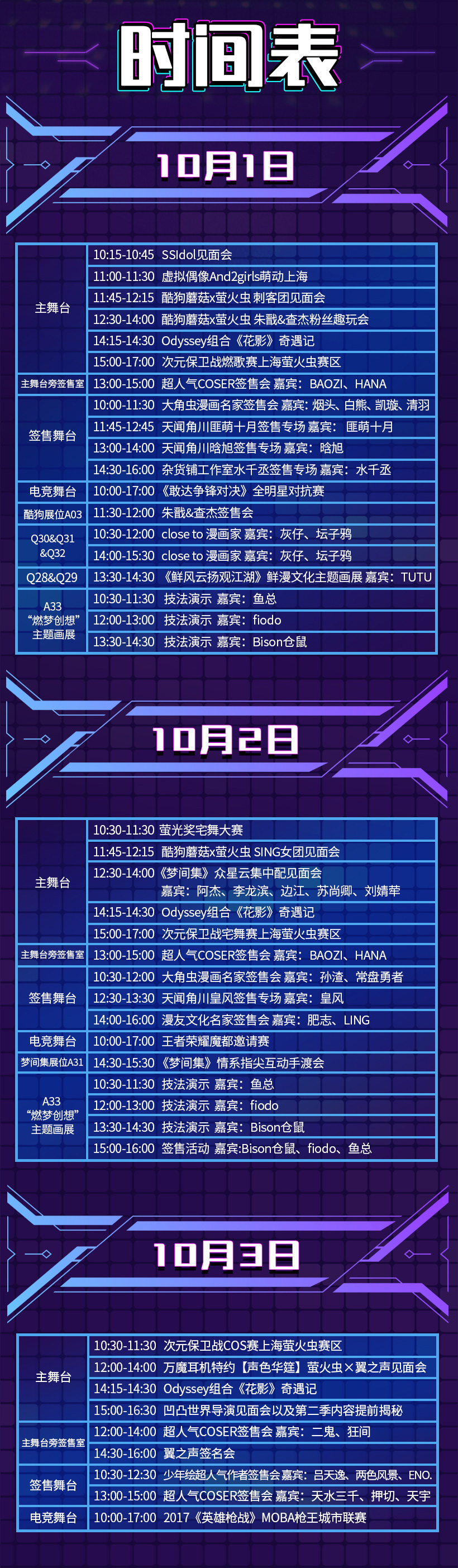 10月1日-3日,上海新国际博览中心将迎来近百位人气红星莅临,朱戬&查杰粉丝趣玩会也将重磅来袭,还有刺客团见面会(王耀辰、李文、房奕飞、阮泽轶)、SING女团见面会等众多精彩活动齐齐亮相。
