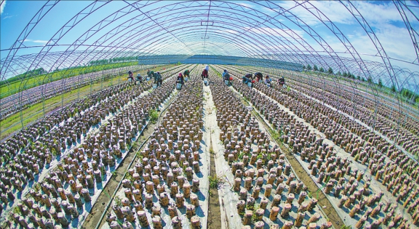 望奎县厢白四村木耳大棚里一片繁忙的景象。