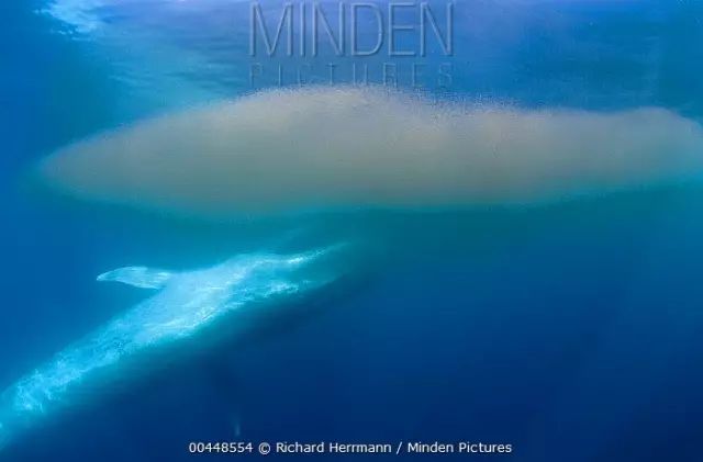 正在捕食的蓝鲸。尽管拥有如此庞大的口,蓝鲸的喉咙却无法吞咽下直径超过足球的物体。图片:Richard Herrmann