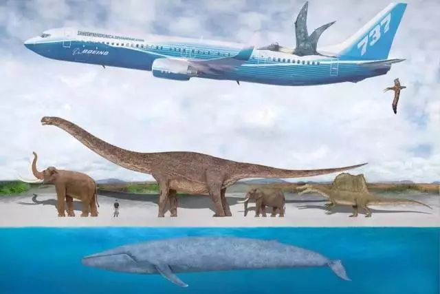 瑞氏普尔塔龙也是比肩阿根廷龙的超大恐龙,也许体长超过蓝鲸,但体重还是没法比。至于可能是最大飞行动物的风神翼龙、可能是最大鸟类的桑氏伪齿鸟、纳玛象、非洲象、棘龙,站在蓝鲸跟前都算小个子。看看背景的波音737-900飞机,你对蓝鲸的大小可能就有些概念了。图片:SameerPrehistorica / dinosaurhome