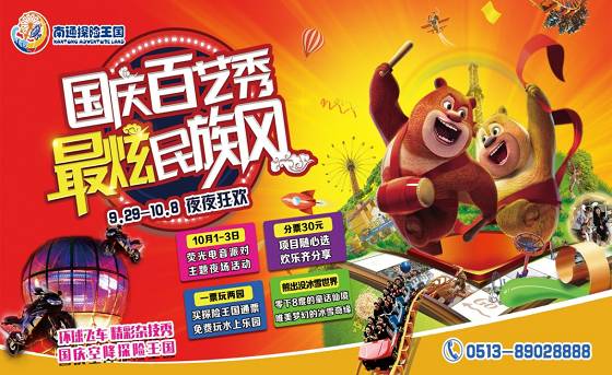 9月29日-10月8日,南通探险王国夜场全面开放,9:30-21:30,疯狂12小时,欢乐不打烊!国庆百艺秀,最炫民族风!中秋国庆双节来临,您还在为去哪里游玩而烦恼吗?这么美好的秋日,就来南通探险王国吧!