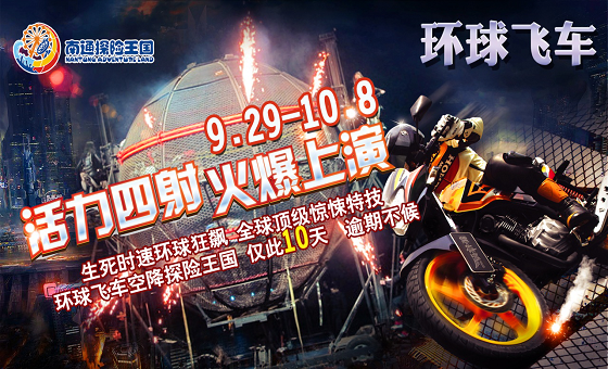 在直径只有几米的环形铁球内,特技演员分别驾驶4、5辆摩托车,以每小时60公里的速度,完成交叉穿越、90°飞行,360°旋转等一系列高难度动作,上演一场让人胆战心惊的飞车特技秀,请你按捺住你紧张的小心脏,尽情助兴加油吧!10月1日-8日,14:00、17:00、19:00,探险王国摩天轮广场,震撼上演急速环球飞车!