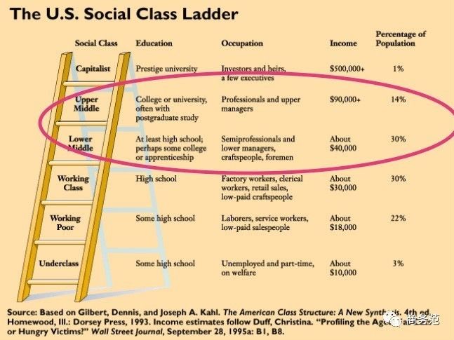 其实呢,美国中产阶层是有一个学术标准哒:学者们根据家庭年收入、职业、以及教育程度,将中产阶层分为上层和下层。