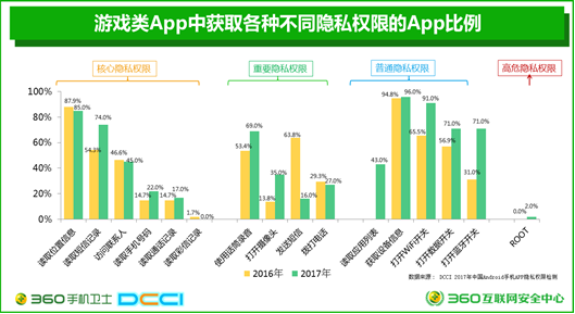 据360联合DCCI发布的《2017年中国手机安全生态报告》显示:与2016年相比,2017年游戏类App获取的普通隐私权限较大增长。“获取设备信息”权限的App比例由94.8%增长到96%,“打开WIFI开关”权限的App比例由65.5%增长到91% ,“打开数据开关”权限的App比例由56.9%增长到71% 。“读取应用列表”是今年新增的检测权限,其隐私获取比例达到了43%。