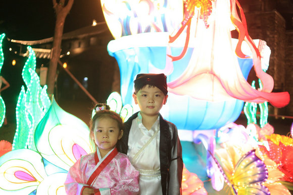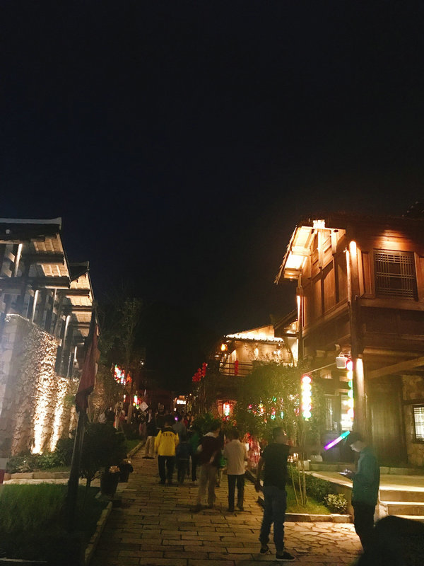 土司城晚间街头游人赏灯留念