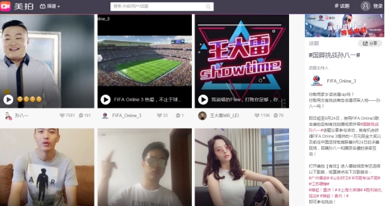 #国脚挑战孙八一#话题在美拍仅半个月便收获了近560万的播放浏览量,而孙八一的单条原创作品短视频亦达到了播放量350万次、评论超过8千条的热度,不仅用户直接参与到了“挑战孙八一”说唱短视频创作录制活动中,许多网友也在评论游戏试玩和喜欢的球队和球员进一步为游戏本身和足球运动带去话题与讨论。