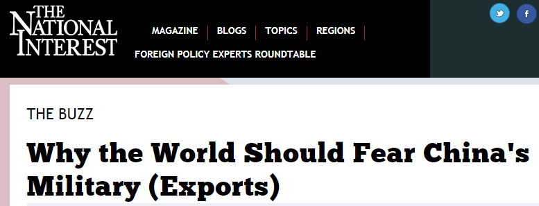 原标题:军情| 美媒称中国武器出口竞争力日益提升:销售额跃居世界第三美国《国家利益》双月刊网站9月27日发表了罗恩·马修斯和平晓娟的文章,渲染“为什么世界应担忧中国的军事出口