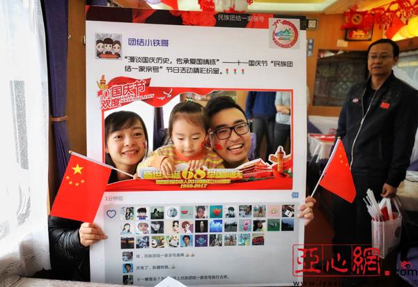 10月1日,在“民族团结一家亲号”特快旅客列车,来自云南昆明的旅客杨宏斌一家合影留念。当天,库尔勒客运段和田1队在列车上组织了迎国庆系列活动,庆祝祖国68岁华诞。