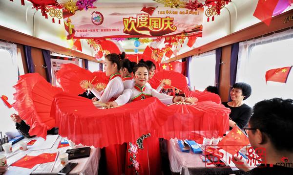 10月1日,在“民族团结一家亲号”特快旅客列车上,铁路工作人员为旅客表演扇子舞《今天是你的生日》,为祖国庆生。