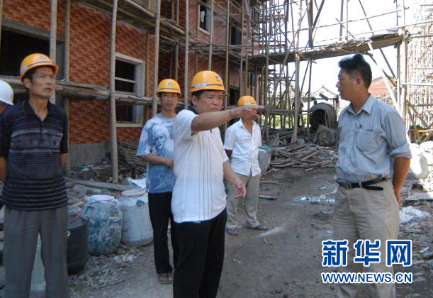 十九大代表、浙江省义乌市城西街道七一村党委书记何德兴(前中)在现场指导旧村改造项目(资料照片)。 新华社发