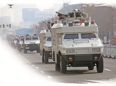 武警新疆总队组织部队开展街面武装震慑行动现场。李和唐摄