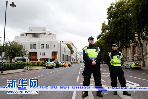 10月7日,在英国伦敦的自然历史博物馆附近,警察因汽车撞人事件封锁通往现场的道路。新华社记者 韩岩 摄