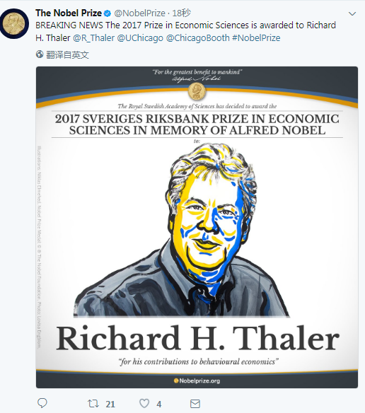 快讯: Richard H. Thaler获得2017年诺贝尔经济学奖。
