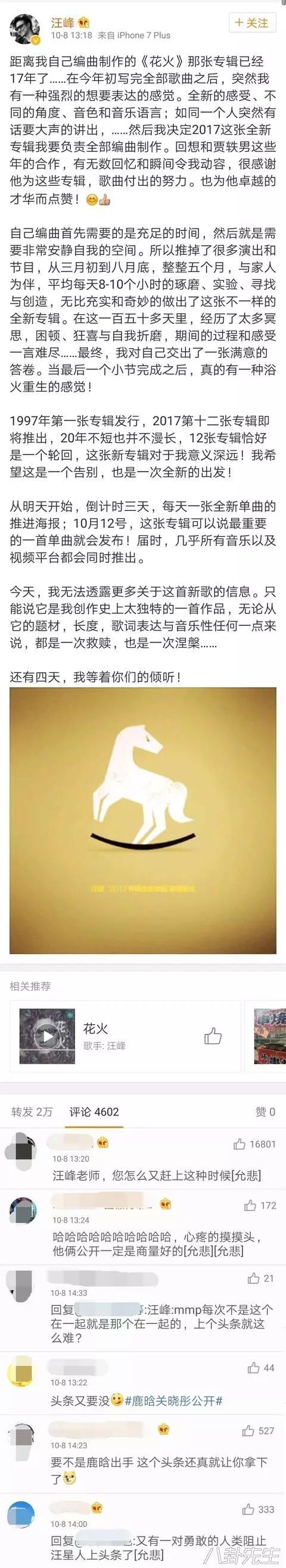 给你们插播一个搞笑的瞬间,在微博都被鹿晗关晓彤刷屏的时候,汪峰出现了