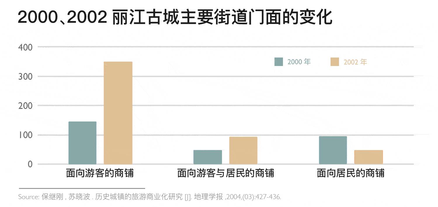 ▍最典型的例子是丽江。随着丽江古城1997 年申遗成功后游客大幅增长,大量居民用房被转作商铺,且多是面向游客的小吃和酒吧,而面向居民的商铺则却不增反减