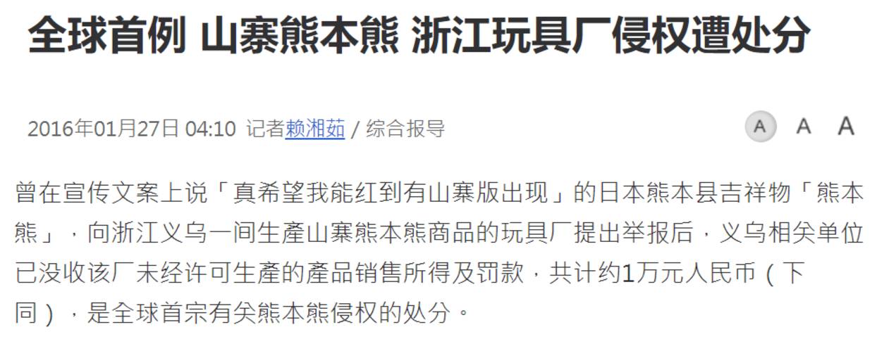 ▍据香港明报报道,义乌一玩具厂未经熊本县许可生产相关形象的玩具,遭到罚金